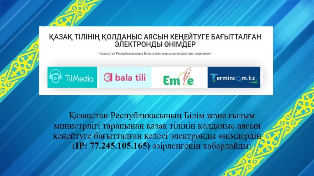 - қазақ тілін үйренуге бағытталған «Tilqural.kz», «Abai.institute», «Tilmedia.kz», «Balatili.kz» порталдары;