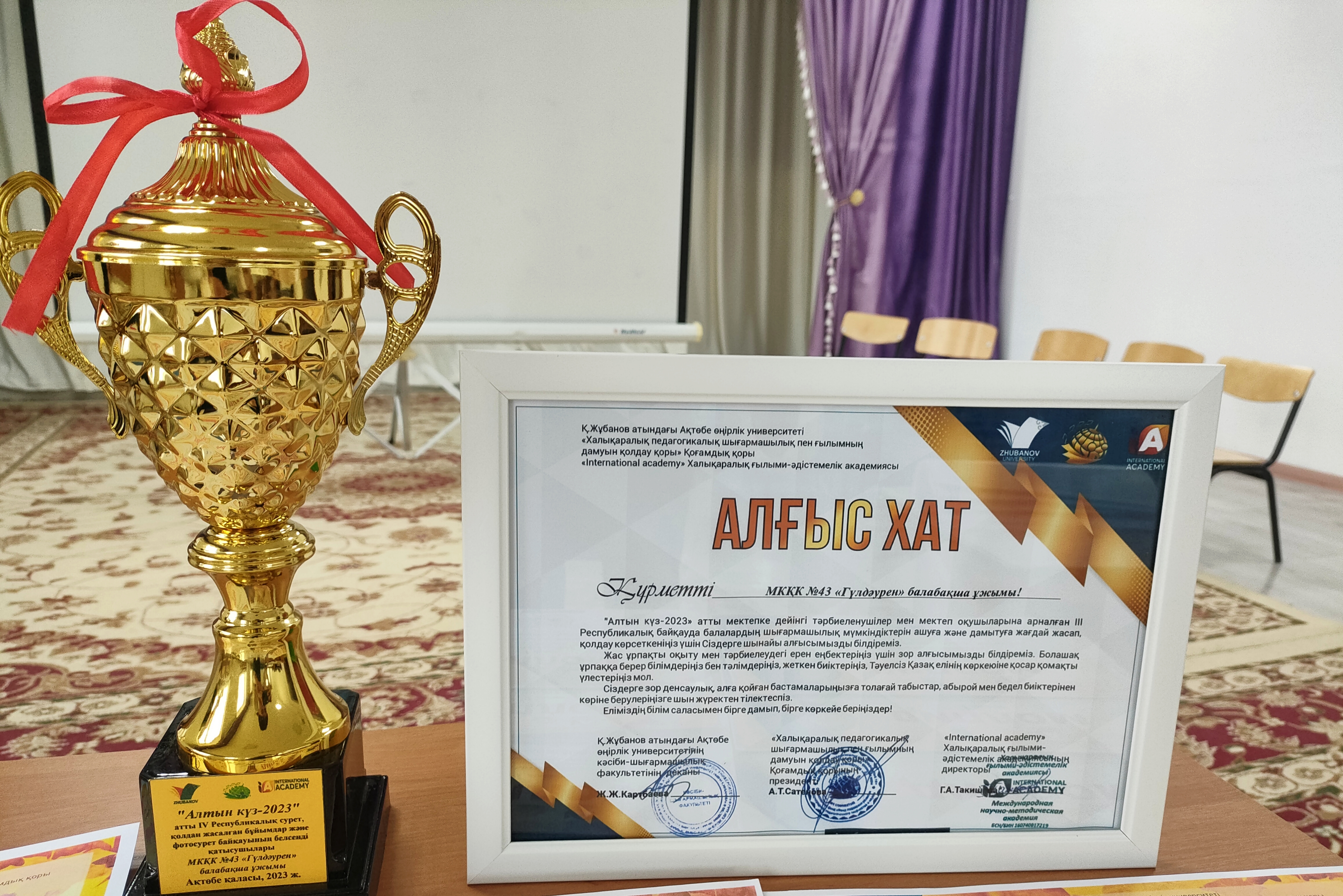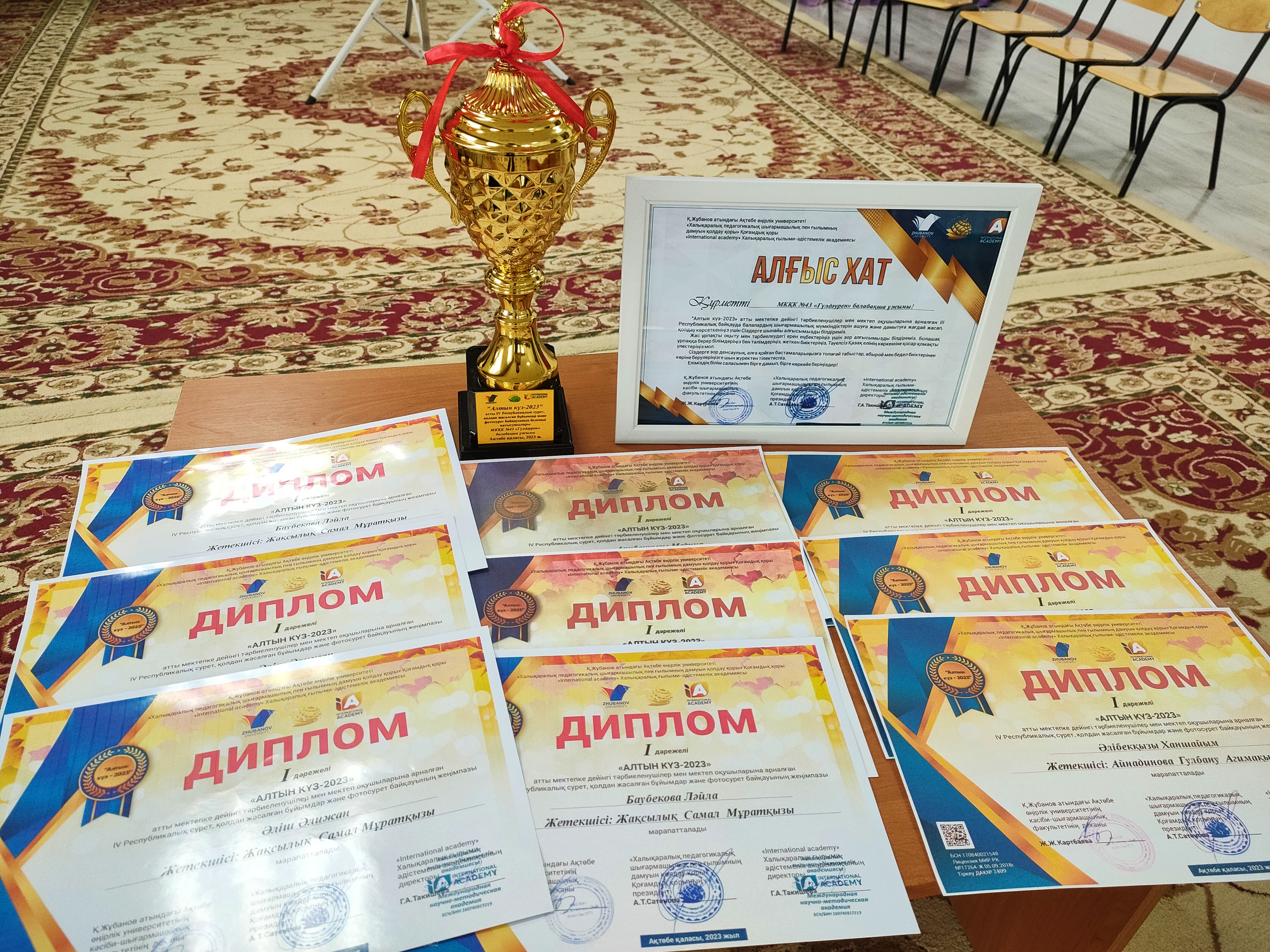 "Алтын күз-2023" атты мектепке дейінгі тәрбиеленушілер мен мектеп оқушыларына арналған IV Республикалық сурет,қолдан жасалған бұйымдар және фотосурет байқауына белсене атсалысқан үшін балабақша ұжымы кубок және алғыс хатпен марапатталды.